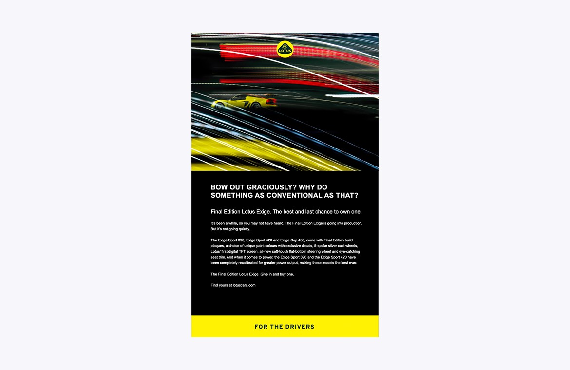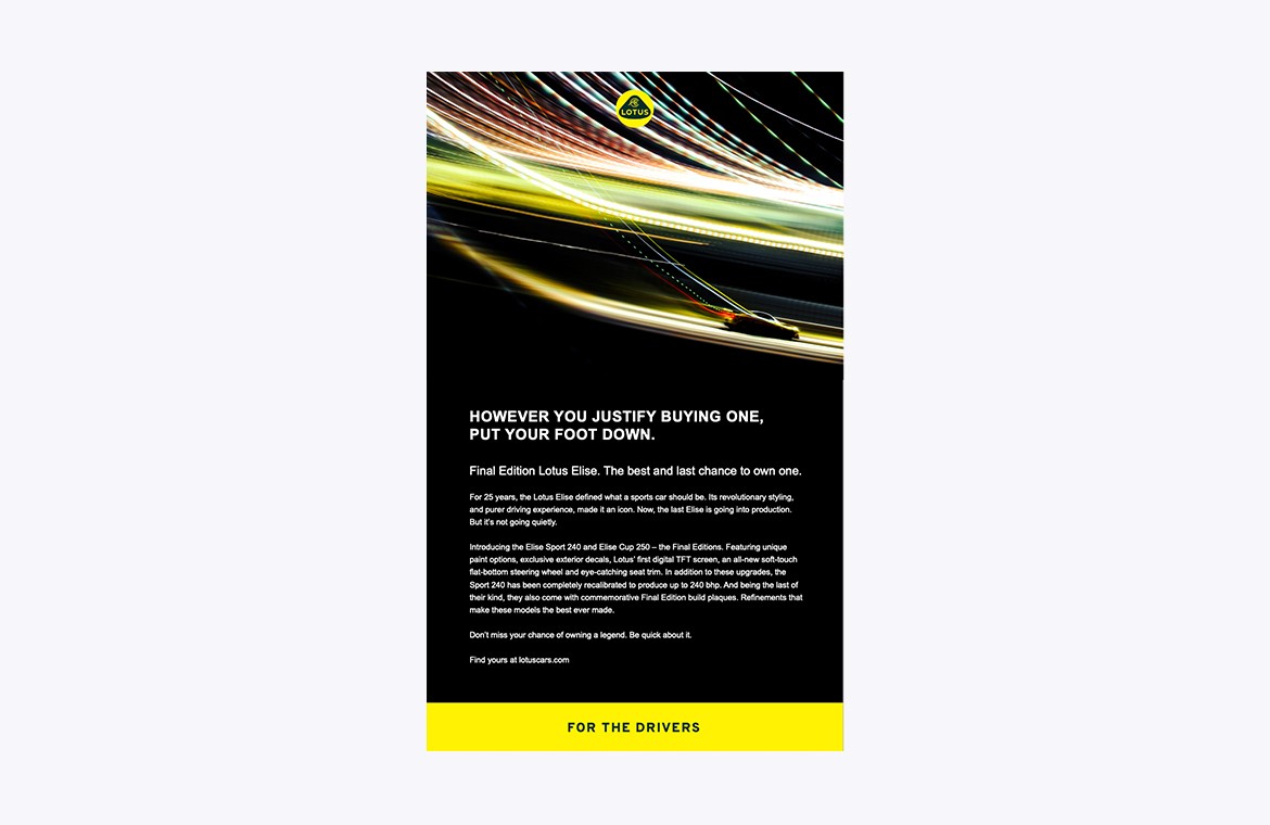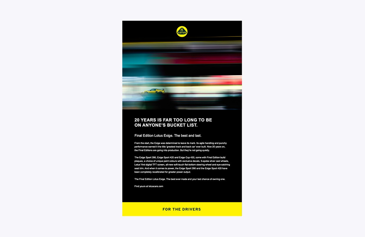 Lotus has always represented sports cars in their purest form. Its maverick attitude shaped the company and the successes of its cars. Two cars, in particular, are the Lotus Elise and its younger track car partner, the Exige. In 2021, the production of these two great sports car icons will come to an end. To mark this incredible story, Lotus is releasing the Final Editions. The best and last Elise and Exige ever.