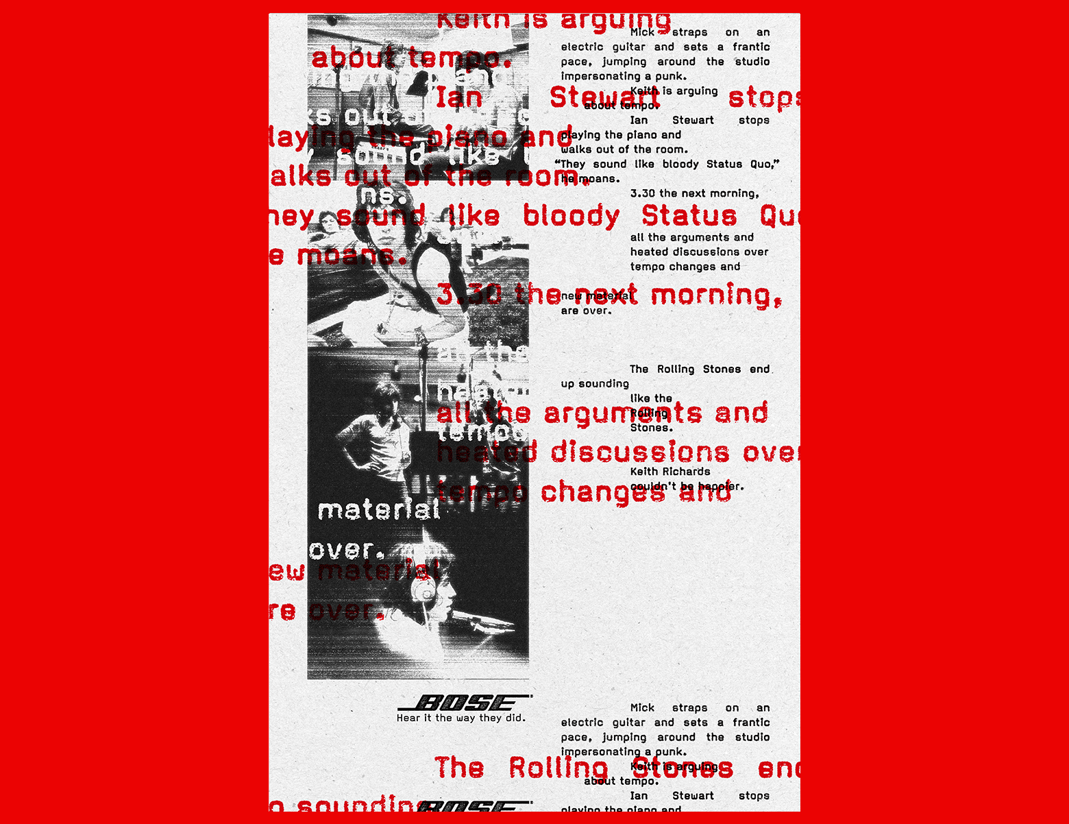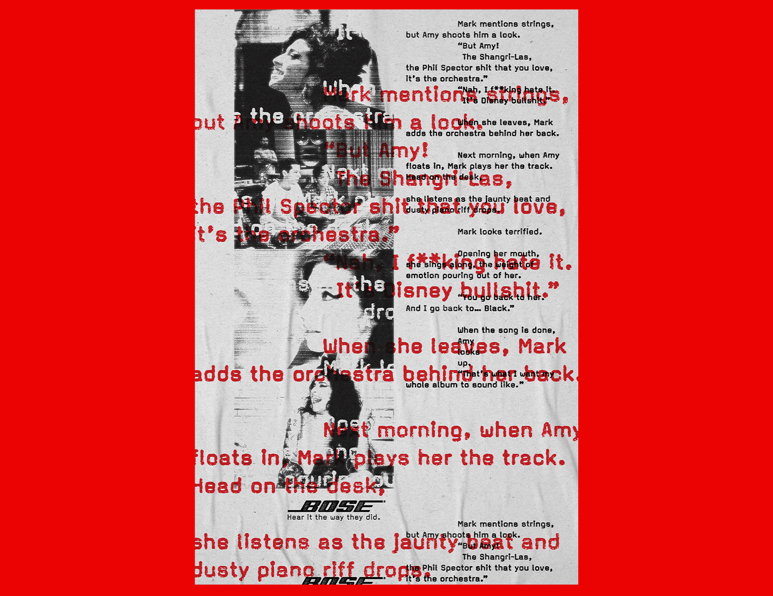 Sound moves, transports, and brings us to life. At Bose, this belief drives the creation of immersive audio tools that deliver music exactly as artists intended. For this campaign, treated archival photographs of Oasis, Amy Winehouse, and The Rolling Stones, in studio settings, were used to evoke raw authenticity and inject energy and drama. The result was a powerful, instantly accessible visual narrative that mirrors Bose’s commitment to crafting audio experiences that place you right in the room, feeling every note as the artist intended.